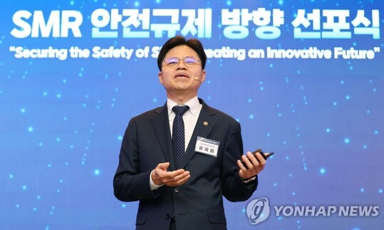 | 18일 서울 중구 프레지던트 호텔에서 열린 SMR(소형모듈원자로) 안전규제 방향 선포식에서 유국희 원자력안전위원장이 SMR 안전규제 방향에 관해 설명하고 있다. (사진=연합뉴스) |