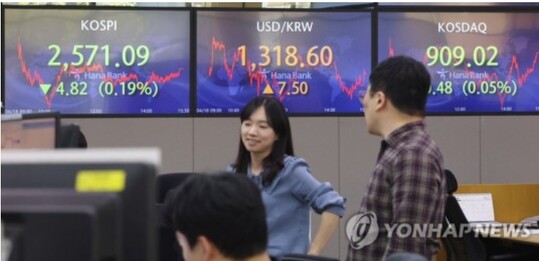 | 18일 서울 명동 하나은행 본점에서 직원들이 증시 및 환율을 모니터하고 있다. 이날 코스피 지수는 4.82p(0.19%) 내린 2,571.09로 장을 마감했다. (사진=연합뉴스) |