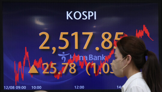 | 8일 서울 중구 하나은행 딜링룸 전광판에 코스피 지수가 표시돼있다. 이날 코스피 종가는 전장보다 25.78포인트(1.03%) 오른 2,517.85, 코스닥지수는 전장보다 17.17포인트(2.11%) 오른 830.37로 거래를 마쳤다. (사진=연합뉴스) |