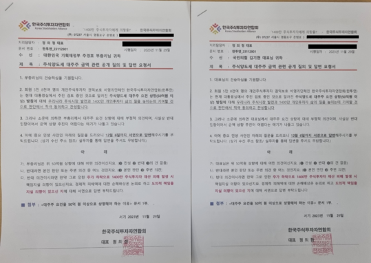 | 한국주식투자자연합회 주식양도세 대주주 금액 관련 공개 질의 및 답변 요청서. (사진=한투연) |