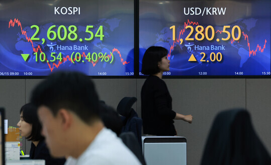 코스피 지수는 전 거래일 대비 10.54포인트(0.40%) 하락한 2608.54에 거래를 마쳤다. 6월 미국의 금리 동결에도 추가 금리 인상 우려 속에 외국인과 기관이 동반 매도에 나선 영향으로 풀이된다.