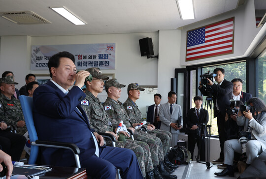 | 윤석열 대통령이 15일 경기 포천 승진훈련장에서 실시된 '2023 연합·합동 화력격멸훈련'에서 쌍안경으로 훈련 현장을 주시하고 있다. (사진=연합뉴스) |