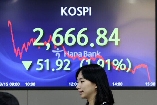 | 코스피가 전장보다 51.92포인트(1.91%) 내린 2,666.84에 거래를 마친 15일 오후 서울 중구 하나은행 본점 딜링룸에서 딜러들이 업무를 보고 있다. (사진=연합뉴스) |