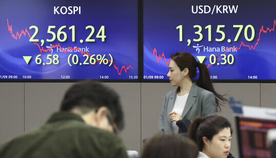 | 코스피 종가가 전장보다 6.58포인트(0.26%) 내린 2,561.24로 집계된 9일 오후 서울 중구 하나은행 딜링룸에서 딜러가 업무를 보고 있다. (사진=연합뉴스) |