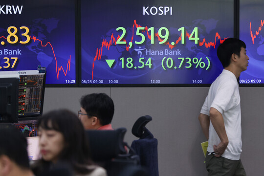 코스피 지수가 잭슨홀 미팅 경계감에 전 거래일 대비 18.54포인트(0.73%) 하락한 2519.14에 장을 마감했다. 이날 외국인과 기관은 각각 1917억원, 1754억원을 팔아치웠고 개인 나홀로 3810억원을 사들였다.
