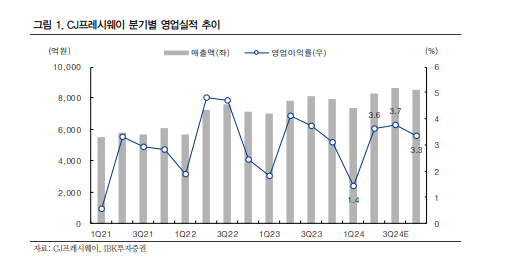 IBK투자증권에 따르면, CJ프레시웨이의 2분기 매출액은 8231억 원으로 전년 동기 대비 5.6% 증가하고, 영업이익은 298억 원으로 7.2% 감소해 기존 예상치를 하회할 것으로 추정된다. 당초 2분기 영업실적 개선을 기대하였으나, 소비경기 악화에 따른 외식경기 둔화로 영업실적 회복은 쉽지 않을 것이란 평가다.