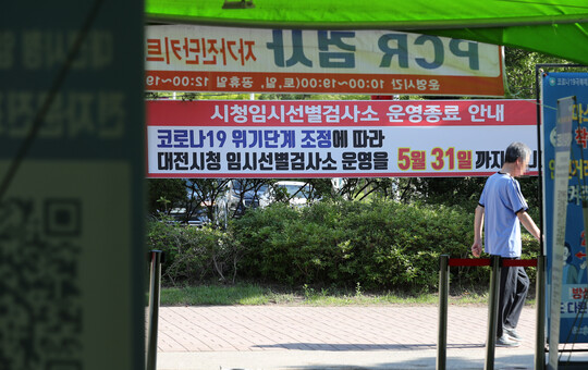 | 31일 오후 대전시 서구 둔산동 대전시청 남문광장에 있는 선별검사소 앞에 안내종료 관련 현수막이 걸려있다. 신종 코로나바이러스 감염증(코로나19) 위기 단계 하향에 따라 대전시는 지난 1년 10개월간 운영한 임시 선별검사소 운영을 다음 달 1일부터 종료한다. (사진=연합뉴스) |