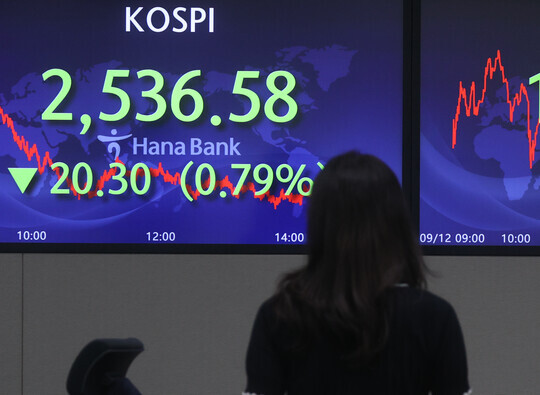 코스피 지수가 전일 대비 20.3포인트(0.79%) 하락한 2536.58에 장을 마쳤다. 지수는 전장보다 9.54포인트(0.37%) 오른 2566.42로 출발한 뒤 하락 전환했다. 이번 주 예정된 미국의 8월 소비자물가지수(CPI) 발표를 앞두고 경계심리가 커지면서 위험자산 기피 심리가 확산한 영향으로 풀이된다.
