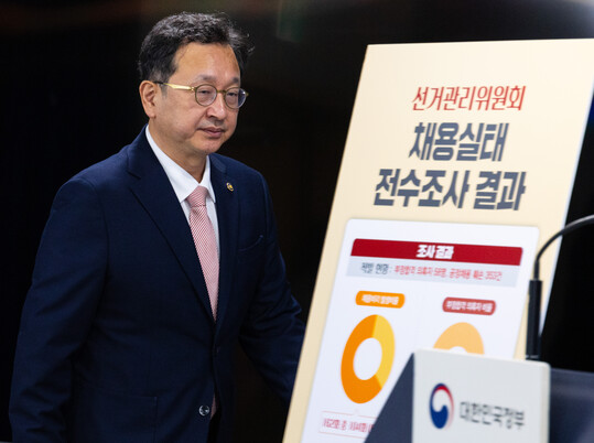 | 정승윤 국민권익위원회 부위원장 겸 사무처장이 11일 오후 서울 종로구 정부서울청사에서 선관위 공무원 경력 채용 전수조사 결과 발표를 하기 위해 회견장으로 입장하고 있다. (사진=연합뉴스) |