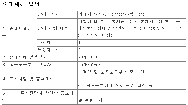 [알파경제=김지현 기자] 한화오션은 8일 거제사업장 PAS공장(중조립공장)에서 근무하던 직영 근로자 1명이 개인 휴게 공간에서 의식불명 상태로 발견된 후 사망하는 중대재해가 발생했다고 공시했습니다.