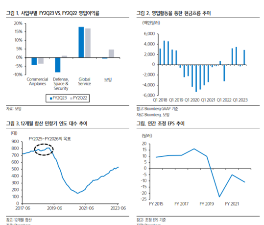 김도현 삼성증권 연구원은 "지난 분기에도 결국 발생하고 말았던 항공기 인도 중단 사태를 고려할 때 상당히 긍정적인 내용의 실적이었다"며 "비록, 회계상의 이익은 적자상태지만, 기업가치를 좌우하는 핵심 변수인 현금흐름 및 항공기 인도 대수의 전망이 유지, 혹은 개선되고 있다는 점이 중요하다"고 판단했다. 글로벌 항공과 국방 업종 중 탑픽(Top Pick) 의견을 유지했다.