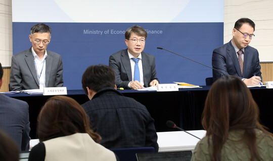| 기획재정부 김동일 예산실장(가운데)이 25일 오후 정부세종청사 기재부 브리핑룸에 서 열린 2025년 예산안 편성 및 기금운용계획안 작성 지침 및 2024년도 조세지출 기본계획과 관련된 브리핑에서 인사말을 하고 있다. 왼쪽부터 박금철 조세총괄정책관, 김 예산실장, 유병서 예산총괄심의관. (사진=연합뉴스) |