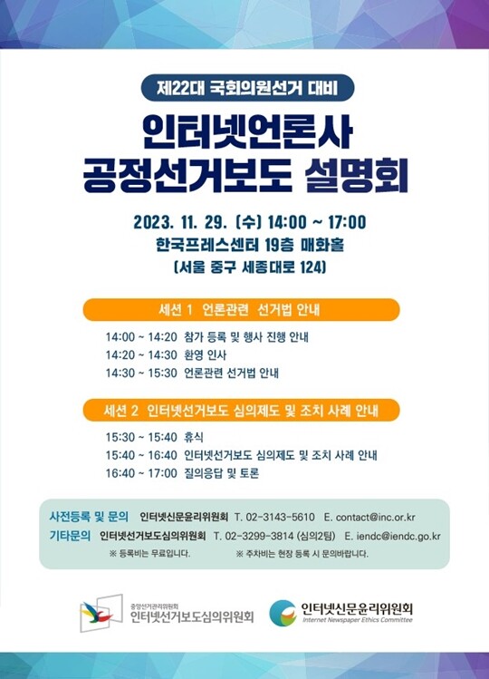 이번 설명회는 2024년 4월 10일에 실시될 예정인 제22대 국회의원선거를 앞두고 ▲언론관련 선거법 ▲인터넷선거보도 심의제도 및 조치 사례 ▲질의응답 및 토론 등의 프로그램으로 진행된다.