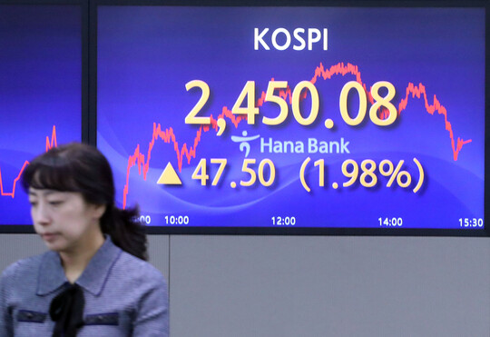 | 코스피가 11일 전장 대비 47.50포인트(1.98%) 오른 2,450.08로 집계됐다. 사진은 서울 중구 하나은행 딜링룸. (사진=연합뉴스) |