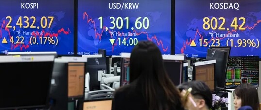 | 3일 오후 서울 중구 하나은행 본점 딜링룸에 이날 거래를 마감한 코스피, 원·달러 환율, 코스닥 지수가 표시돼 있다. 사진= 연합뉴스 |