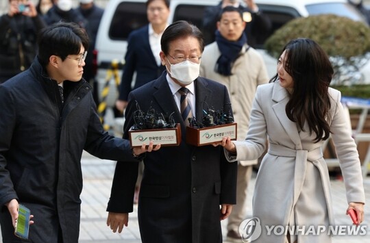 | 지난 대선 과정에서 허위 발언을 한 혐의로 재판에 넘겨진 더불어민주당 이재명 대표가 3일 오전 서초구 서울중앙지방법원에서 열린 공직선거법 위반 혐의 사건 첫 재판에 출석하기 위해 법정으로 향하고 있다.사진= 연합뉴스 |