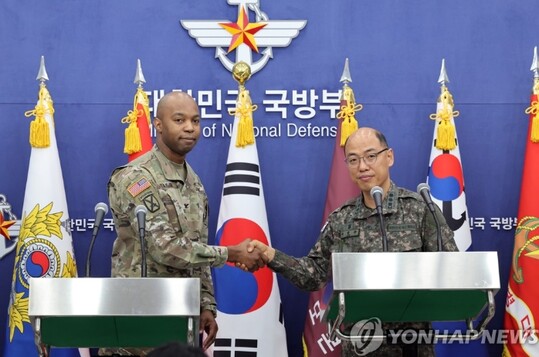 | 이성준 합동참모본부 공보실장과 아이작 테일러 한미연합사 공보실장이 3일 오전 서울 용산구 국방부에서 한미 '2023 자유의방패(FS)' 연합연습 계획에 대해서 공동 브리핑 후 악수하고 있다. 사진= 연합뉴스 |