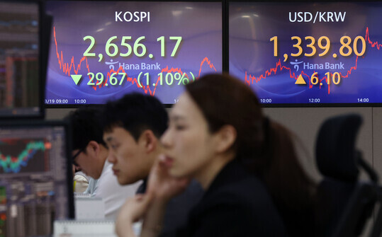 | 19일 오후 서울 중구 하나은행 딜링룸 전광판에 코스피 지수 등이 표시되고 있다. (사진=연합뉴스) |