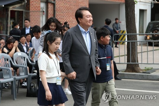 | 윤석열 대통령이 4일 서울 용산 대통령실의 앞마당에 조성된 용산 어린이정원 개방행사에 어린이들과 손을 잡고 입장하고 있다. (사진=연합뉴스) |