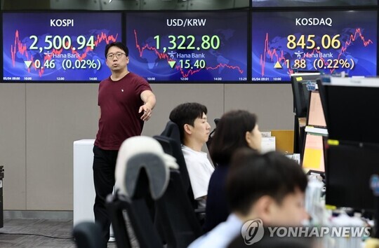 | 코스피가 전날보다 0.46포인트(0.02%) 내린 2,500.94로 집계된 4일 오후 서울 중구 하나은행 본점 딜링룸에서 딜러들이 업무를 보고 있다. (사진=연합뉴스) |