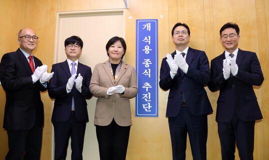 | 송미령 농식품부 장관(왼쪽 세 번째)이 22일 오후 정부세종청사에서 에서 제막 후 박수를 치고 있다. (사진=연합뉴스) |