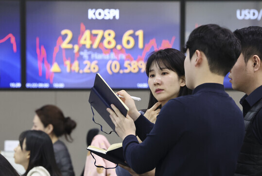 | 코스피가 전장보다 14.26포인트(0.58%) 오른 2,478.61로 장을 마감한 23일 서울 중구 하나은행 본점 딜링룸에서 딜러들이 업무를 보고 있다. (사진=연합뉴스) |