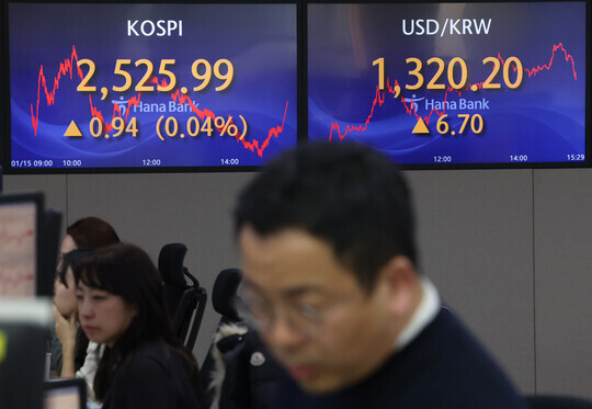 | 15일 오후 서울 중구 하나은행 본점 딜링룸 현황판에 코스피, 원달러 환율이 표시돼 있다. 이날 코스피는 전 거래일보다 0.94포인트(0.04%) 오른 2525.99로 마감했다. (사진=연합뉴스) |