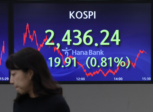 | 16일 오후 서울 중구 하나은행 본점 딜링룸 현황판에 코스피, 원달러 환율, 코스닥 지수가 표시돼 있다. 이날 코스피는 전 거래일보다 19.91포인트(0.81%) 내린 2436.24로 마감했다. (사진=연합뉴스) |