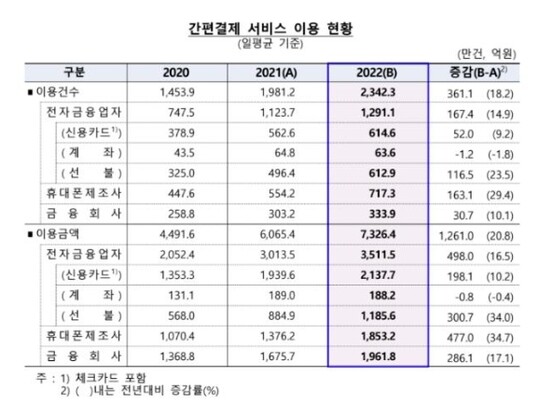 간편결제와 간편송금도 급증했다. 지난해 일평균 간편결제 서비스 이용건수는 2342만건, 이용금액은 7326억원으로 각각 집계됐다. 이는 전년 대비 건수는 18.2%, 금액은 20.8% 늘어난 금액으로 사상 최대치다.