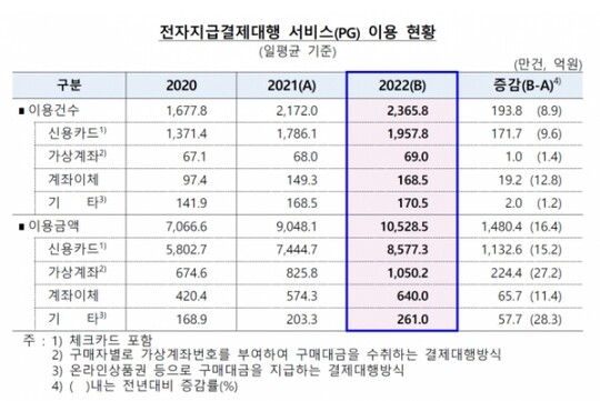 24일 한국은행이 발표한 ‘2022년 중 전자지급서비스 이용 현황’에 따르면 2022년 전자금융업자와 금융회사가 제공하는 전자지급서비스 중 전자지급결제대행(PG) 서비스의 일평균 이용건수는 2366만건, 일평균 이용금액은 1조 529억원으로 집계됐다. 이는 2021년보다 각각 8.9%, 16.4%씩 증가한 수치로 사상 최대규모다.