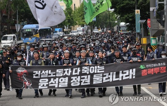 | 4일 오후 서울역 인근 한강대로에서 민주노총 건설노조원들이 용산 대통령실 방향으로 결의대회 전 행진을 하고 있다. (사진=연합뉴스 자료사진) |