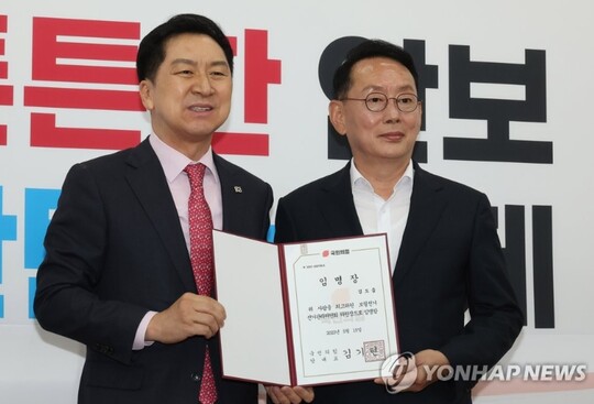 | 국민의힘 김기현 대표가 15일 오전 서울 여의도 국회에서 열린 최고위원 보궐선거 선거관리위원회 임명장 수여식에서 김도읍 위원장에게 임명장을 수여하고 있다. (사진=연합뉴스) |