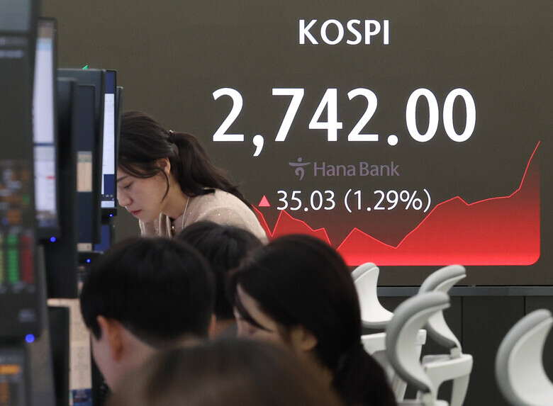 | 4일 오후 서울 중구 하나은행 본점 딜링룸에서 직원들이 업무를 보고 있다. 이날 코스피는 전장보다 35.03포인트(1.29%) 오른 2,742.00에, 스닥지수는 전 거래일보다 2.94포인트(0.33%) 상승한 882.90에 장을 마쳤다. (사진=연합뉴스) |
