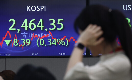 | 코스피가 전장보다 8.39p(0.34%) 내린 2,464.35로 마감한 22일 오후 서울 중구 하나은행 딜링룸에서 딜러들이 업무를 보고 있다. (사진=연합뉴스) |