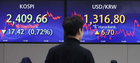 | 10일 서울 명동 하나은행 본점 딜링룸에서 직원들이 증시 및 환율을 모니터링하고 있다. 이날 코스피는 전장보다 17.42포인트(0.72%) 내린 2,409.66에 거래를 마쳤다. (사진=연합뉴스) |