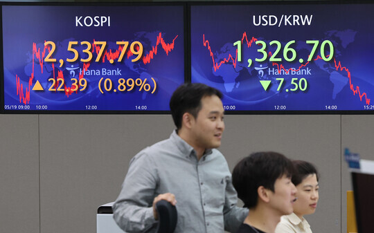 | 코스피가 강세를 보여 2,530대로 상승한 19일 오후 서울 중구 하나은행 본점 딜링룸에서 직원들이 업무를 보고 있다. (사진=연합뉴스) |