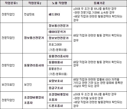그 하부에는 정보통신전문가, 데이터분석가, 정보보안전문가, 동물관리종사자, 동물미용사, 요양보호사, 응급구조사, 초경량비행장치조종자, 드론조종사를 추가했고, 이 밖에 헤드헌터, 요양보호사, 응급구조사 직업명을 신설했다.