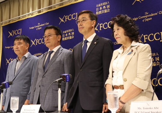 | 후쿠시마 핵오염수 해양투기 저지 국회의원단과 일본 입헌민주당 아베 도모코 의원이 12일 도쿄 외국특파원협회에서 열린 기자회견에 앞서 사진 촬영에 응하고 있다. 이들은 일본 정부에 오염수 방류 계획 철회를 요구했다. 오른쪽부터 아베 의원, 더불어민주당 위성곤·윤재갑 의원, 한국 어민 박연환 씨. (사진=연합뉴스) |