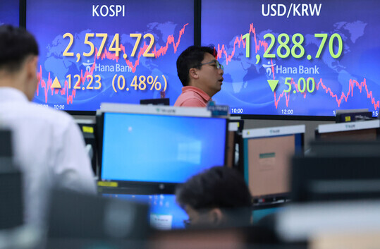 | 12일 오후 서울 중구 을지로 하나은행 본점 딜링룸 현황판에 코스피, 원달러 환율 종가가 표시돼 있다. 이날 코스피는 12.23포인트(0.48%) 오른 2,574.72로 장이 종료됐다. (사진=연합뉴스) |