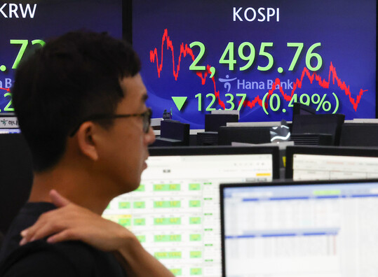 | 25일 서울 중구 하나은행 본점 딜링룸 현황판에 코스피가 표시돼 있다. 이날 코스피는 전장보다 12.37p(0.49%) 내린 2,495.76으로 마감했다. (사진=연합뉴스) |
