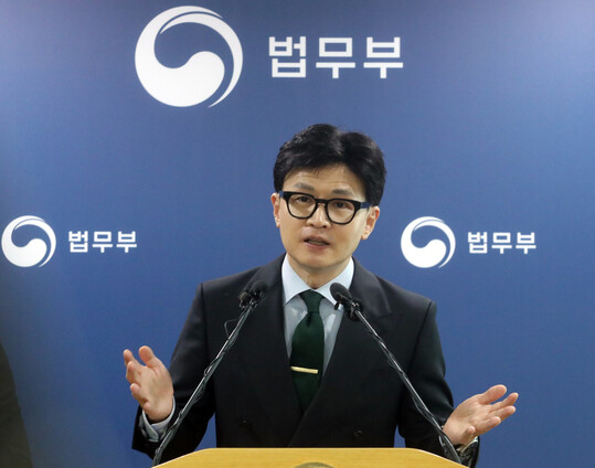| 한동훈 법무부 장관이 25일 오후 정부과천청사에서 기자회견을 열고 '숙련기능인력 3만5천명 혁신적 확대 방안'(K-포인트 E74)을 시행한다고 밝히고 있다. (사진=연합뉴스) |