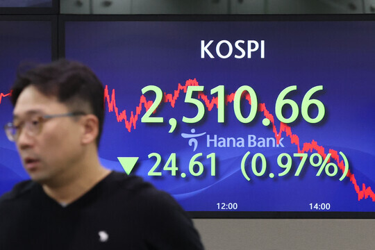 | 13일 오후 서울 중구 하나은행 딜링룸 현황판에 코스피 종가가 표시돼 있다. 이날 코스피는 전장보다 24.61포인트(0.97%) 내린 2,510.66으로 마감했다. (사진=연합뉴스) |