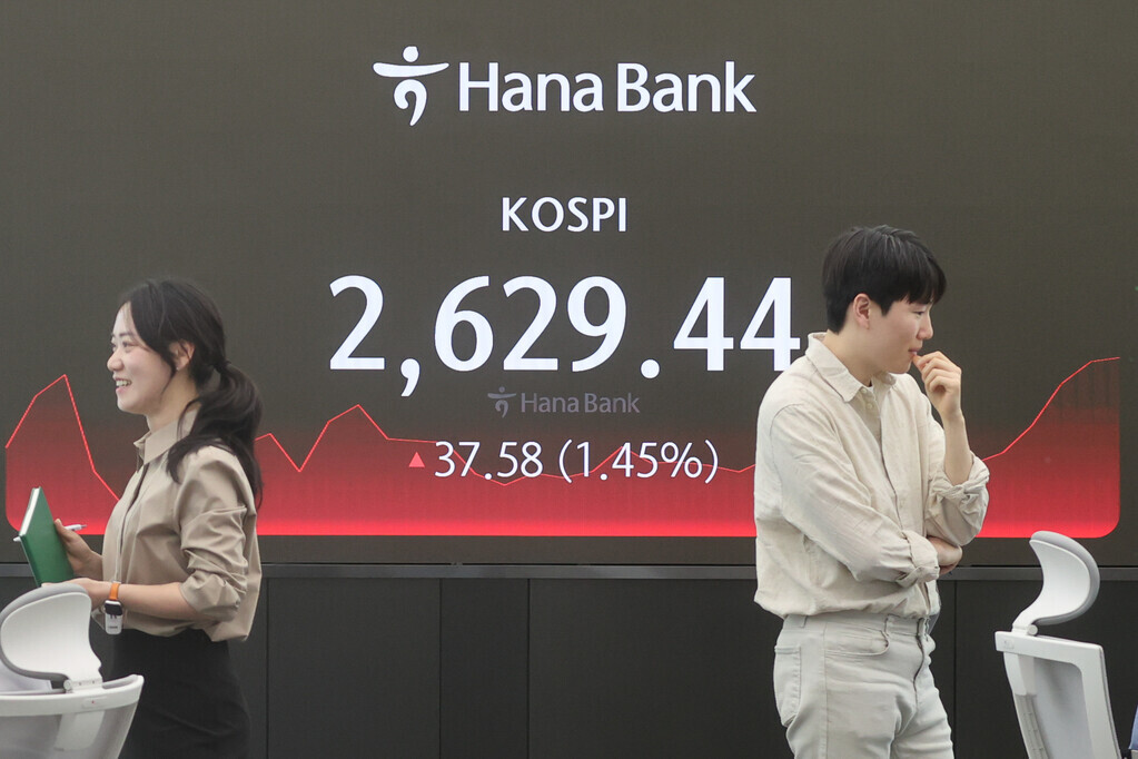 | 코스피가 22일 전장보다 1.45% 상승해 2,629.44에 장을 마쳤다. 사진은 이날 장을 마친 서울 중구 하나은행 본점 딜링룸 모습. (사진=연합뉴스) |