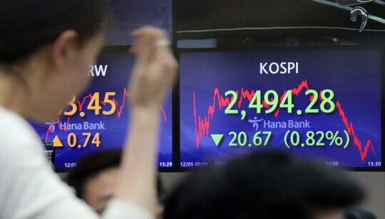 | 코스피가 5일 2,500선을 지키지 못하고 하락 마감했다. 이날 코스피 종가는 전장보다 20.67포인트(0.82%) 내린 2,494.28로 집계됐다. (사진=연합뉴스) |