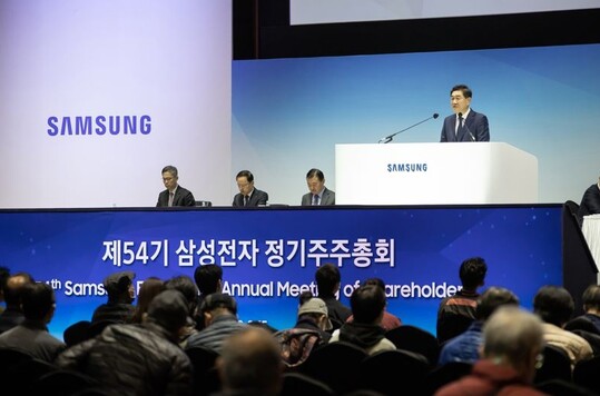 이날 삼성전자 주주총회에선 의장 인사에 이어 경영현황 설명, 의안 표결 등이 진행됐다. 의안은 ▲재무제표 승인 ▲사내이사 한종희 선임 ▲이사 보수한도 승인의 건이 상정됐고 의결을 거쳐 통과됐다.
