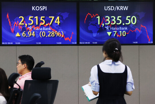 | 22일 오후 서울 중구 하나은행 본점 딜링룸 현황판에 코스피 지수와 원달러 환율이 표시돼 있다. 이날 코스피는 전 거래일보다 6.94포인트(0.28%) 오른 2515.74로 마감했다. (사진=연합뉴스) |