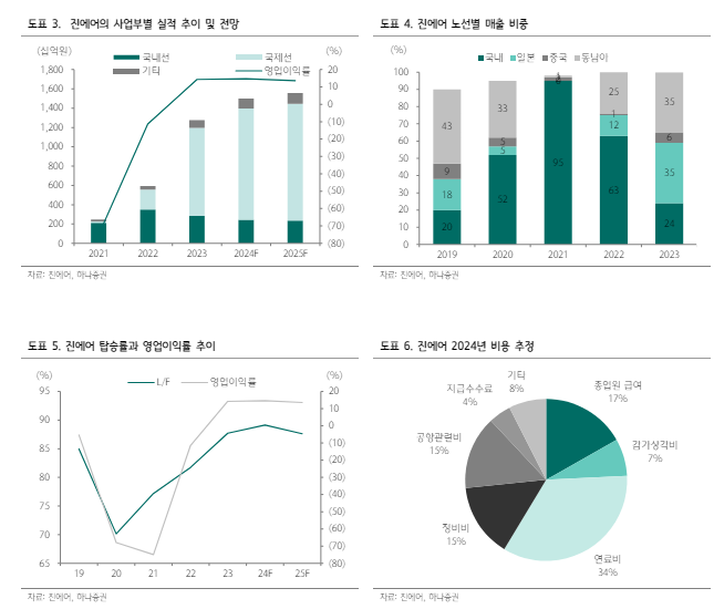 하나증권에 따르면, 2024년 진에어의 매출액은 전년 대비 18% 증가한 1조 5015억원, 영업이익은 21% 증가한 2196억원으로 추정된다. 국내선 매출이 전년 대비 15% 감소하나, 국제선 매출이 27% 증가하며 성장을 견인할 것이란 분석이다.