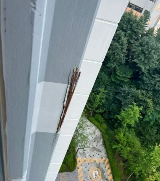 | 서울 강동구 상일동 '고덕 롯데캐슬 베네루체' 외벽에 철근이 튀어나온 모습. (사진=온라인 커뮤니티) |