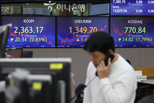| 25일 오후 서울 중구 을지로 하나은행 딜링룸 현황판에 코스피와 원달러 환율이 표시돼 있다. 이날 코스피는 전장보다 20.34포인트(0.85%) 내린 2,363.17에 거래를 마쳤다. (사진=연합뉴스) |