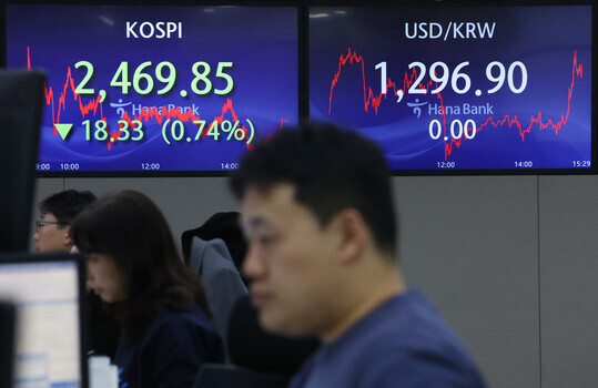 코스피 지수가 전 거래일 대비 18.33포인트(0.74%) 내린 2469.85로 집계됐다. 지수는 전장보다 10.75포인트(0.43%) 내린 2477.43으로 출발한 뒤 하락 폭을 키웠다.